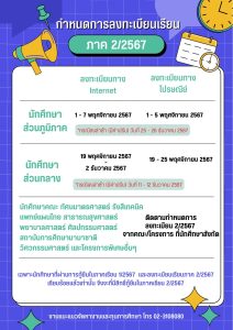 1. นักศึกษาลงทะเบียนเรียน ภาคเรียน 2/67 เรียบร้อยแล้ว ให้อัปโหลดไฟล์ใบเสร็จลงทะเบียนเรียน ภาค 2/67 ในลิ้งค์ที่แนบ โดยสามารถกรอกข้อมูลได้ตั้งแต่บัดนี้ – 17 มกราคม 2568