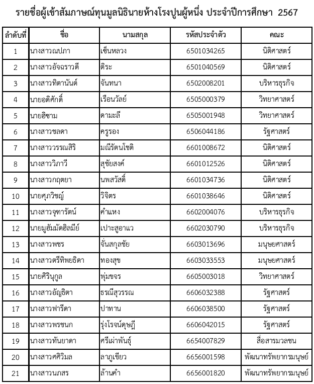 กำหนดให้มีการสัมภาษณ์ทุนการศึกษา ในวันอังคารที่ 15 ตุลาคม 2567 ทั้งนี้ นักศึกษาสามารถติดตาม