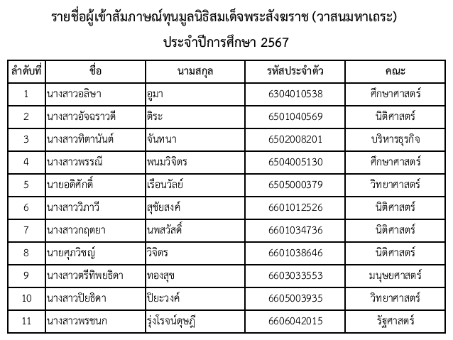 ในเบื้องต้นเรียบร้อยแล้ว ดังนั้น จึงขอประกาศรายชื่อนักศึกษาที่ผ่านคุณสมบัติ เพื่อเข้ารับการสัมภาษณ์